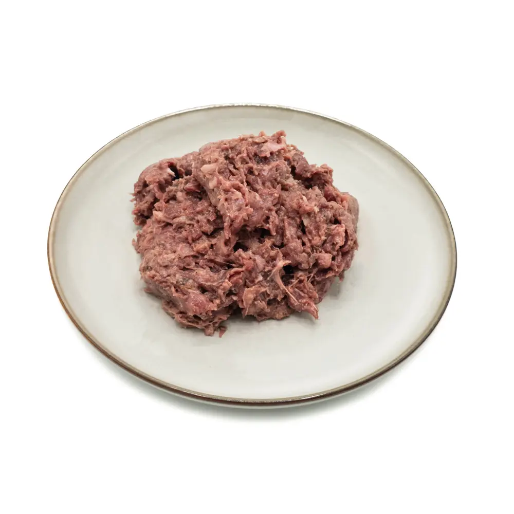 40% kippenrug, 10% hertenvlees, 10% runderhart, 10% lamspens, 10% makreel, 5% paardenlever, 5% lamsribben, 9% insect (bsf), 1% vitamines en mineralen