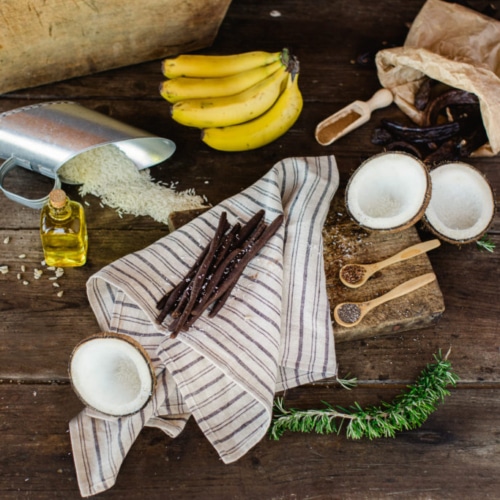 rijstmeel, 28% johannesbroodmeel, 5.6% bannan, appel, lijnzaad, hennepzaad, rozemarijn, kokos, vet