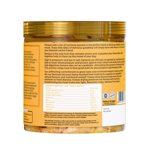 Pawfect natures munch dog treats banana zijn heerlijke, natuurlijke snacks voor honden van alle leeftijden. deze smakelijke traktaties zijn gemaakt van 100% gevriesdroogde banaan, zonder toegevoegde suikers, kleurstoffen of conserveringsmiddelen. ze zijn niet alleen onweerstaanbaar lekker, maar ook rijk aan vezels en voedingsstoffen die bijdragen aan een gezonde spijsvertering en een glanzende vacht.