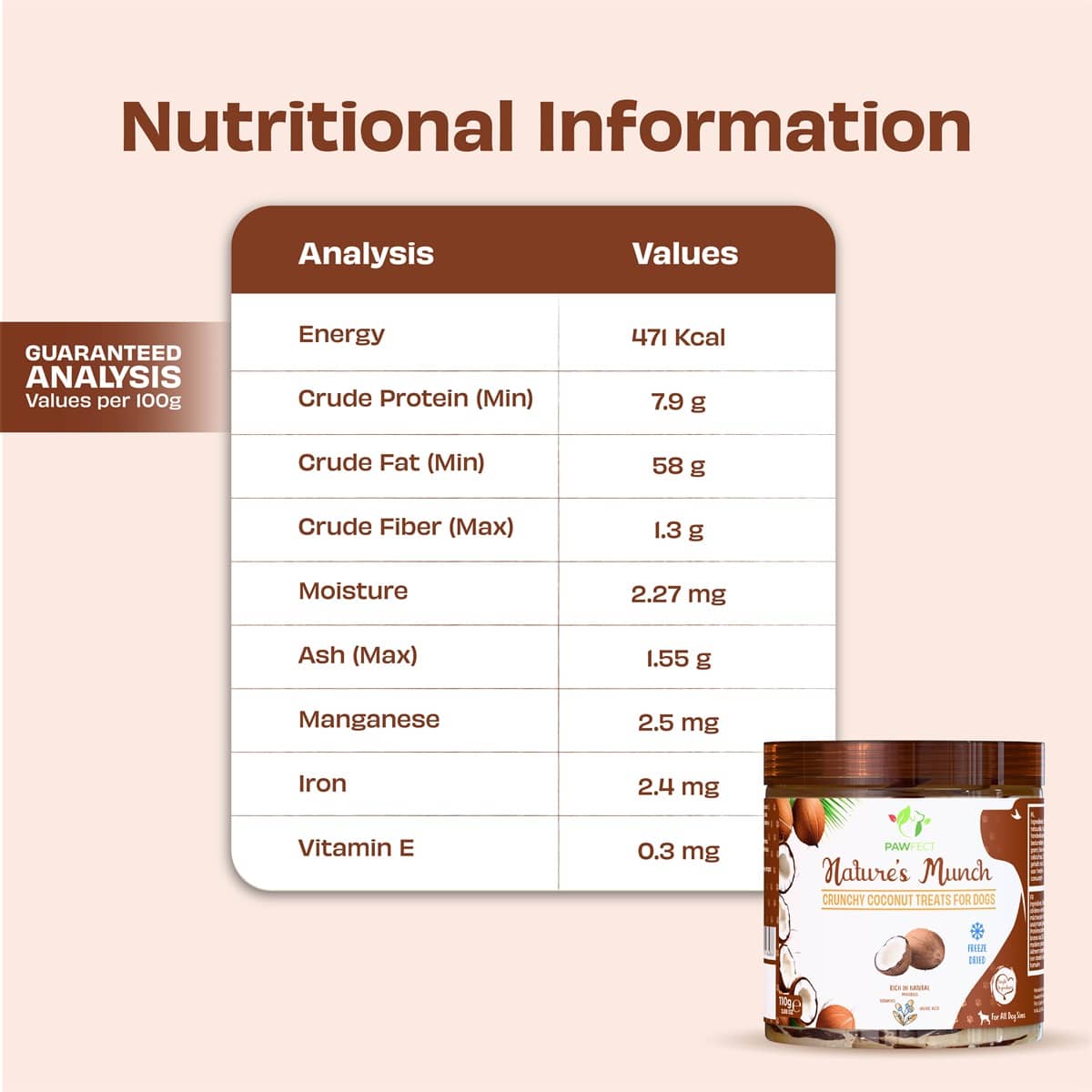 Pawfect natures munch dog treats coconut is 100% natuurlijk en vrij van bindmiddelen, geur- kleur- en smaakstoffen. Er wordt er ook geen pesticide op de producten gebruikt tegen insecten, het kan voorkomen dat er een torretje of ander insect in uw snack terecht is gekomen. Indien u dit ziet kunt u het best de snacks 48 uur in de vriezer bewaren, dan zijn ook eventuele eitjes dood. De insecten vormen geen gevaar voor uw dier.