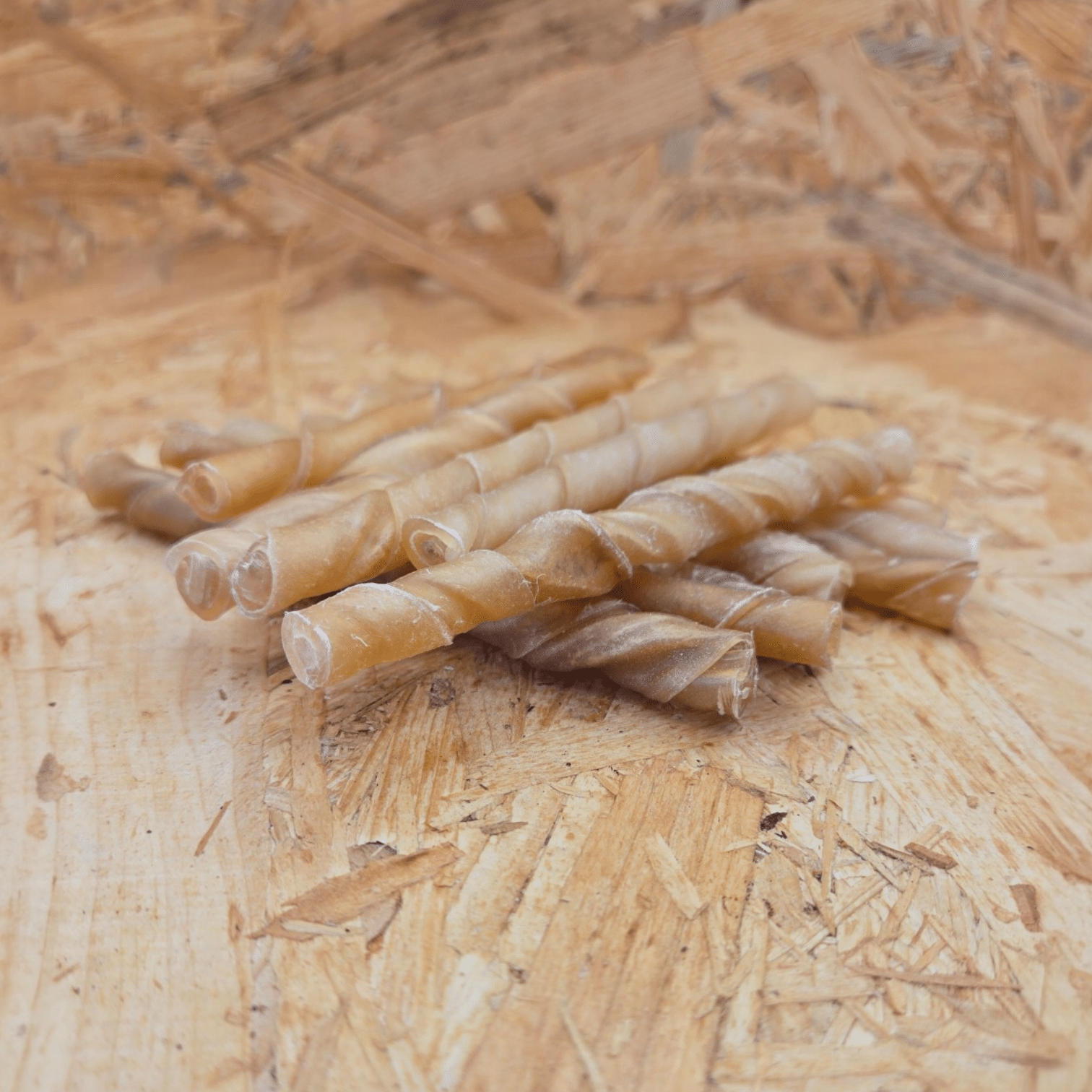 Rawhide twisters zijn stevige, gedraaide kauwstaafjes van runderhuid met een lengte van ongeveer 12 tot 13 cm. Deze natuurlijke hondensnack is ideaal voor honden die graag langdurig kauwen en behoefte hebben aan extra uitdaging. Door de gedraaide vorm moeten honden meer moeite doen om de snack zachter te krijgen, wat niet alleen verveling tegengaat, maar ook bijdraagt aan een betere gebitsverzorging.